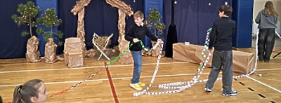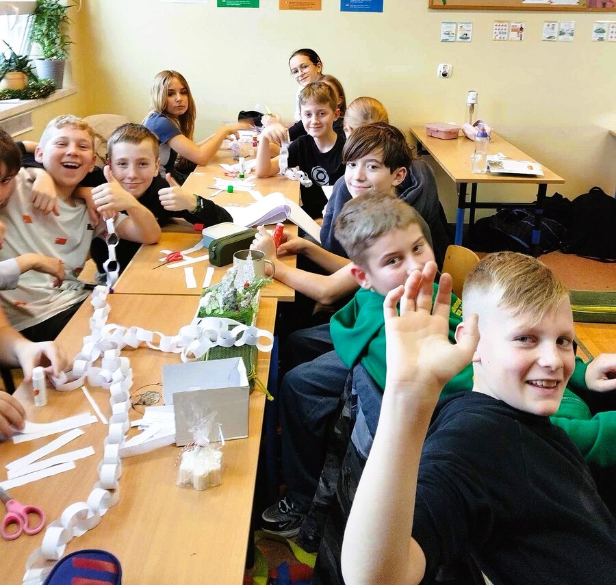 Staramy się z naszymi uczniami wracać do dawnych tradycji, które charakteryzowały czas Świąt Bożego Narodzenia. Czasem jednak to sami uczniowie potrafią nas zaskoczyć. Tym razem w zachwyt wprowadził nas wszystkich pomysł klasy VI, która przez ostatnie kilka dni postanowiła stworzyć jak najdłuższy łańcuch choinkowy. W przedsięwzięcie zaangażowali się praktycznie wszyscy spędzając każdą wolną chwilę w szkole na cięciu, klejeniu, łączeniu i dobrej zabawie. Nie trzeba dodawać, że nic nie łączy tak jak wspólna praca. Dlatego też kibicowali im wszyscy, a efekty tego przedsięwzięcia przekroczyły nasze najśmielsze oczekiwania. W zaledwie kilka dni klasie VI b udało się wykonać 160 metrowy łańcuch choinkowy, który zaprezentowali wszystkim podczas szkolnego kolędowania.