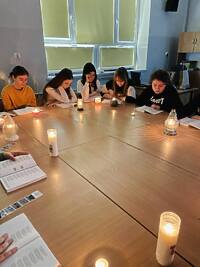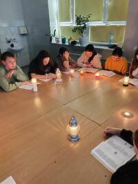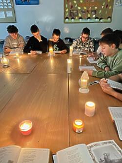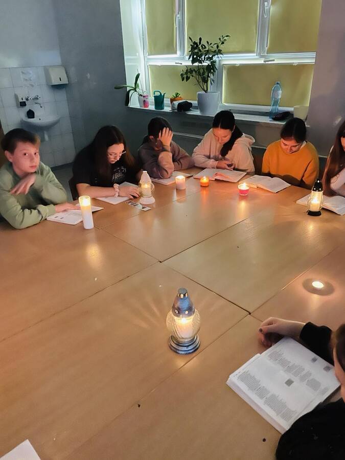 Spotkanie z lekturą miało miejsce w nieco tajemniczej atmosferze - przy blasku świec. Uczniowie wcielali się w role postaci z dramatu i głośno czytali tekst naszego wieszcza. Widać było ekscytację i zaangażowanie młodych aktorów.