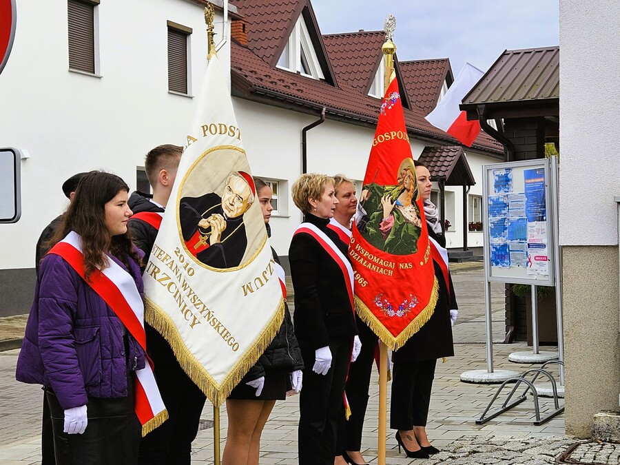 Druga część świętowania miała miejsce pod Tablicą Pamiątkową przy Urzędzie Gminy w Trzcinicy, gdzie odśpiewany został Mazurek Dąbrowskiego, a przybyłe delegacje złożyły kwiaty i znicze. Wójt Gminy Trzcinica – Pan Grzegorz Hadzik przybliżył charakter tego wyjątkowego dla Polaków święta oraz podziękował wszystkim za wzięcie udziału w obchodach.