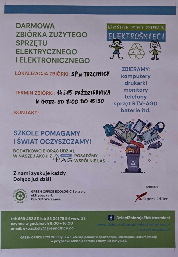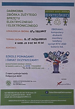 Zbędne urządzenia elektryczne można dostarczyć na plac wewnętrzy przy naszej szkole w poniedziałek w godzinach pracy szkoły oraz we wtorek rano.