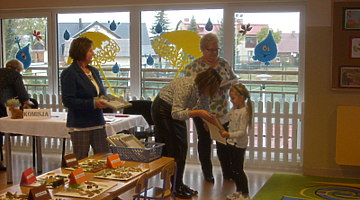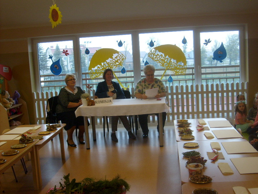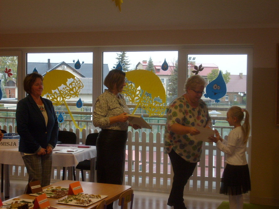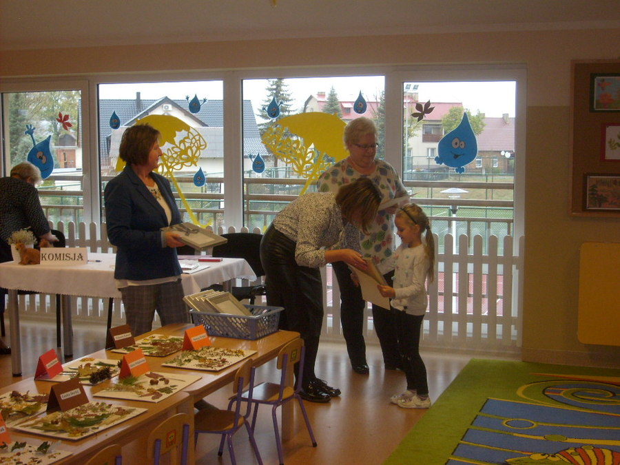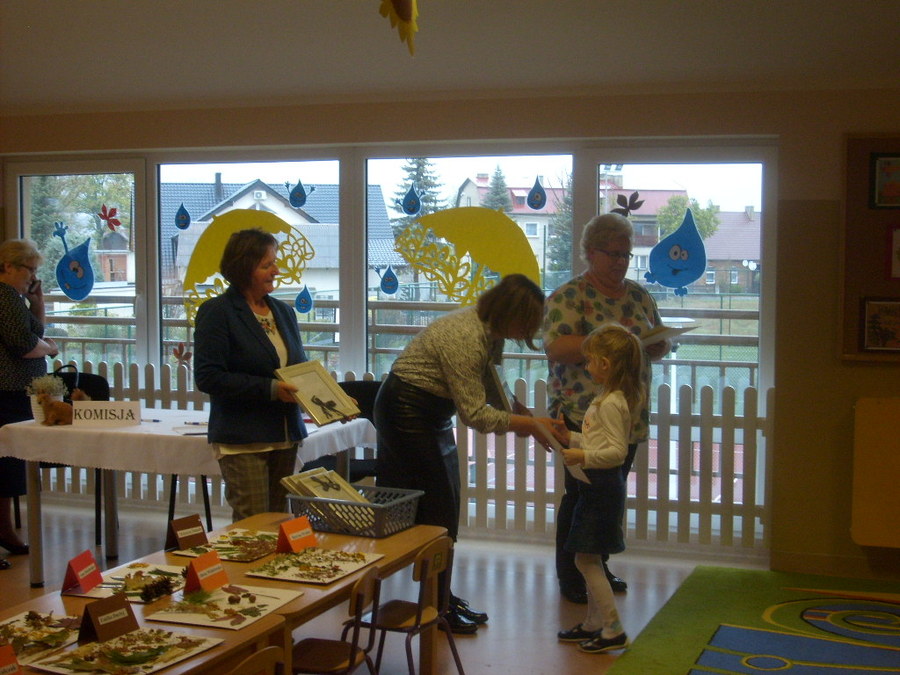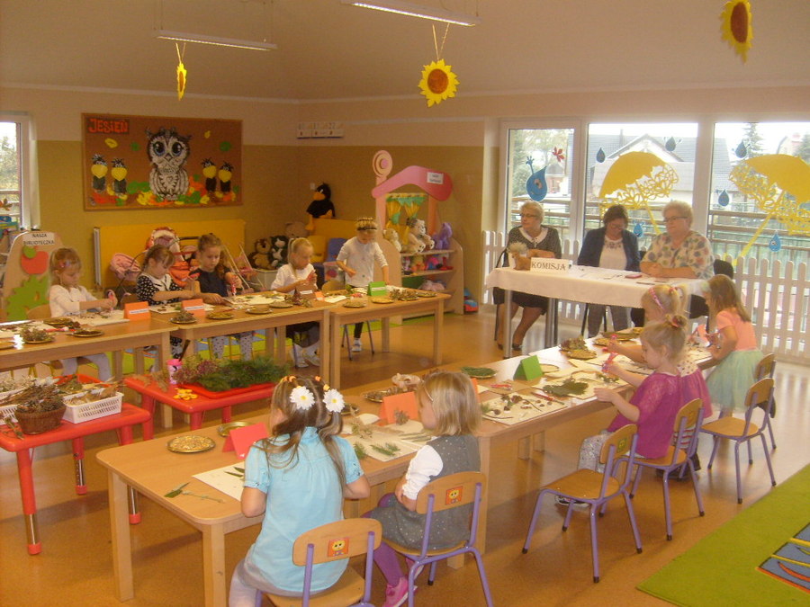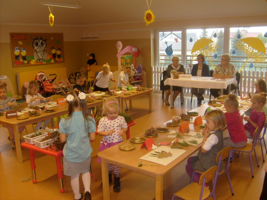 Pani Mariola Bednarek – kierownik przedszkola powitała dzieci, opiekunów i członków komisji konkursowej. Pani Aneta Jędryca przedstawiła temat tegorocznego konkursu „Jesienny obraz” i zapoznała uczestników ze sposobem pracy i przygotowanymi materiałami, zaprezentowała przykładowe obrazy wykonane z darów jesieni i zaprosiła dzieci do działania.