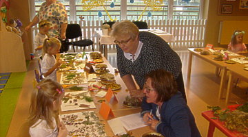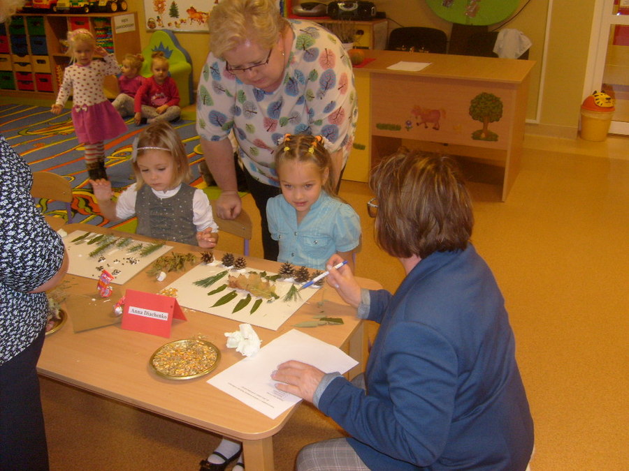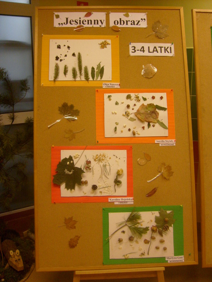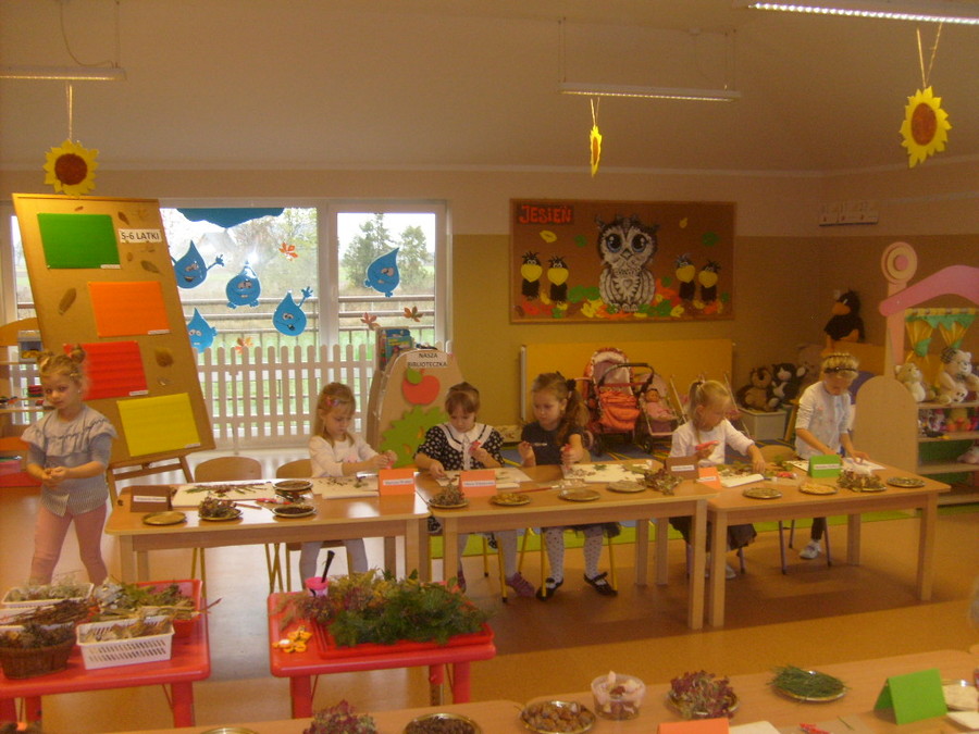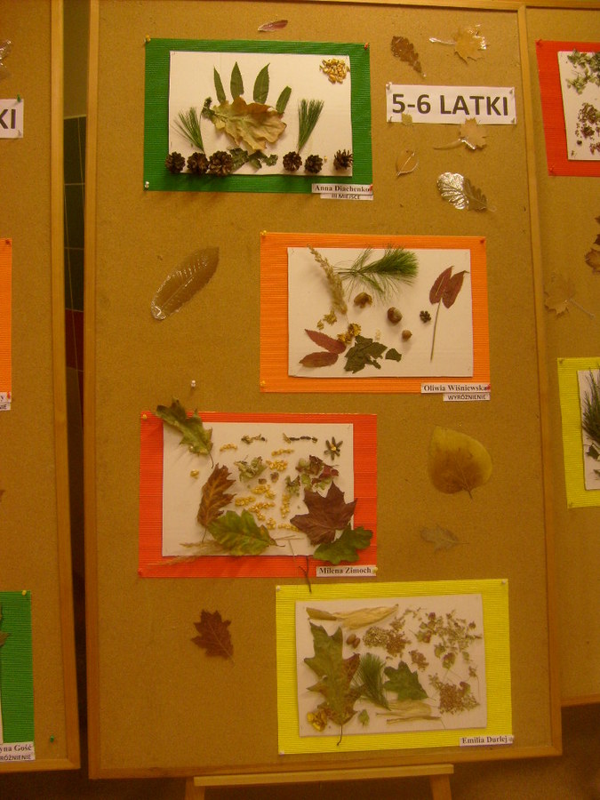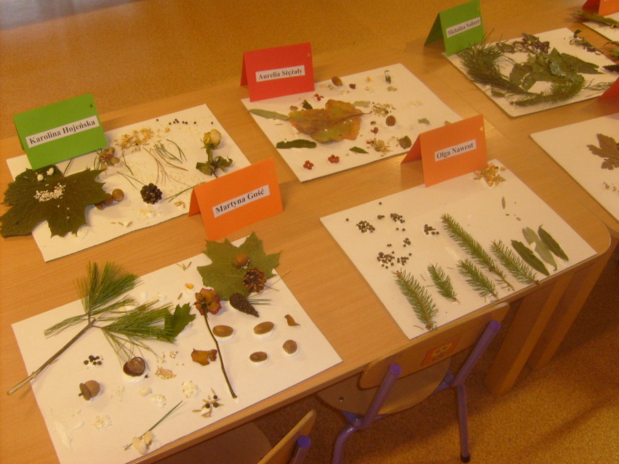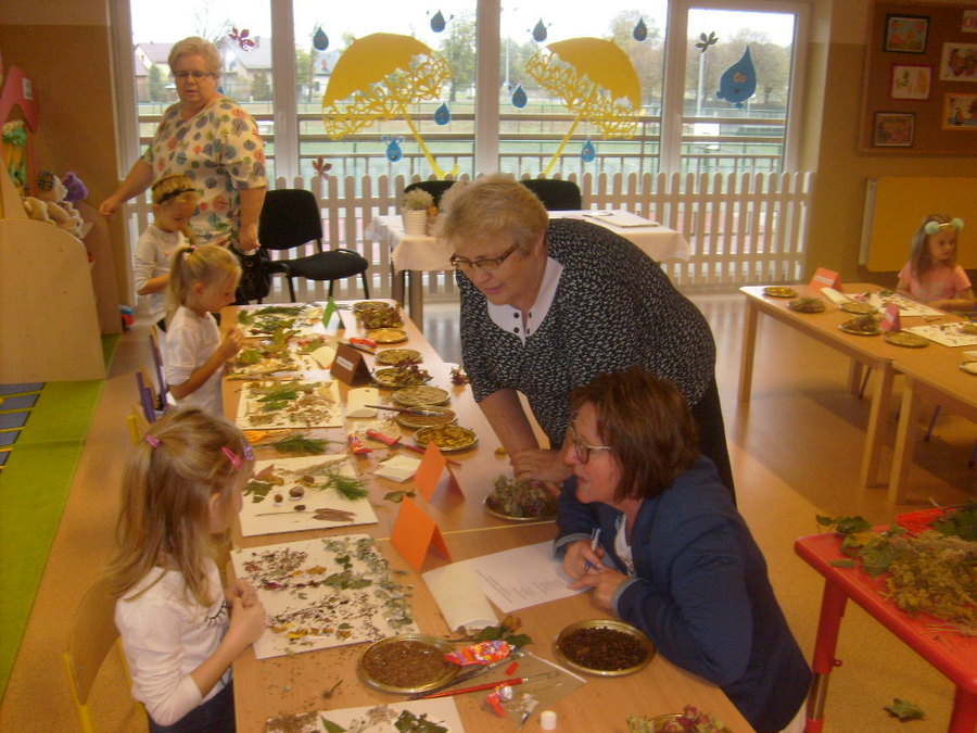 Mali artyści dowolnie dobierali wysuszone rośliny i nasiona do swoich prac i stworzyli w ten sposób niepowtarzalne obrazy. Powstały zwierzęta, ptaki i leśne stworki. Po skończeniu pracy plastyczno-technicznej każdy uczestnik opowiadał o swoim dziele. Z wykonanych prac została stworzona piękna wystawa, którą podziwiała cała przedszkolna brać.