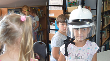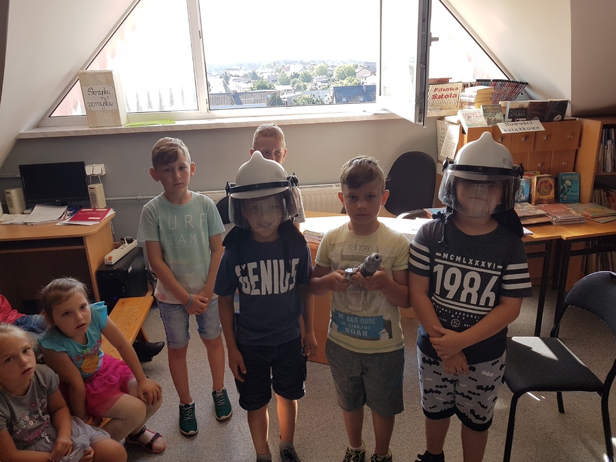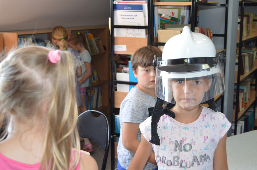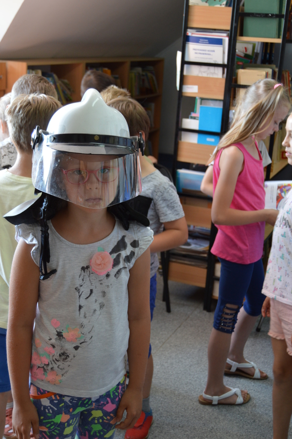 Do biblioteki zostali zaproszeni pierwszoklasiści, którym pani Ewa przeczytała utwór Jana Brzechwy „Pali się”. Historia zawarta w książce okazała się bardzo zabawna i pouczająca. Podczas spotkania dzieci mogły zobaczyć i przymierzyć prawdziwy hełm strażacki i wziąć do ręki sprzęt strażacki (prądownicę). Chłopcy deklarowali, że w przyszłości zostaną strażakami. Dzieci były bardzo zadowolone z tego spotkania. Na zakończenie każdy uczestnik otrzymał słodki upominek.