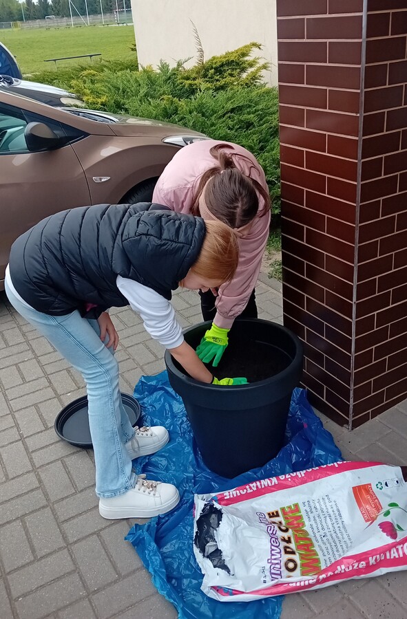 Kolejna akcja ekologiczna w trakcie trwającego TYGODNIA PRZYRODNICZEGO - to sadzenie roślin przez uczniów naszej szkoły. 22 kwietnia uczniowie kl. V i VIII zasadzili w dwóch donicach zasadzili pelargonie i komarzyce, które zdobią wejście do szkoły.
