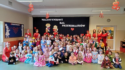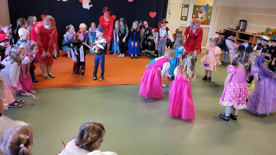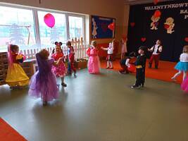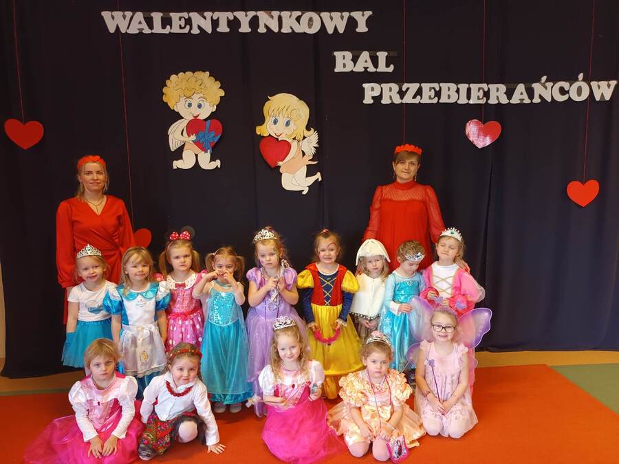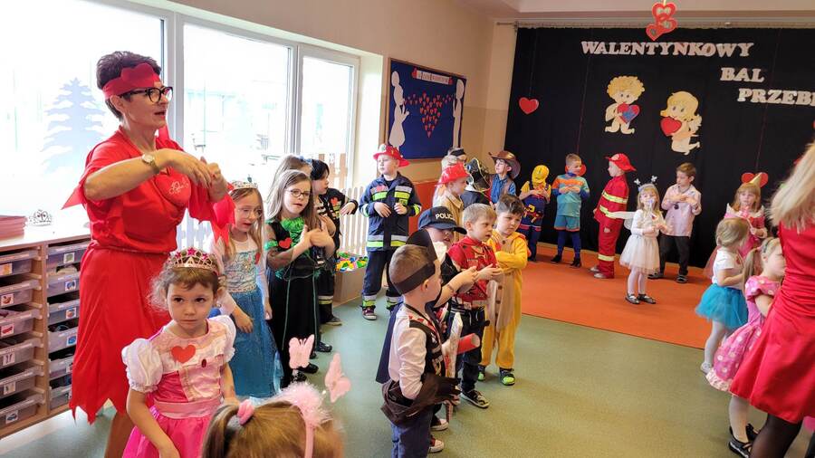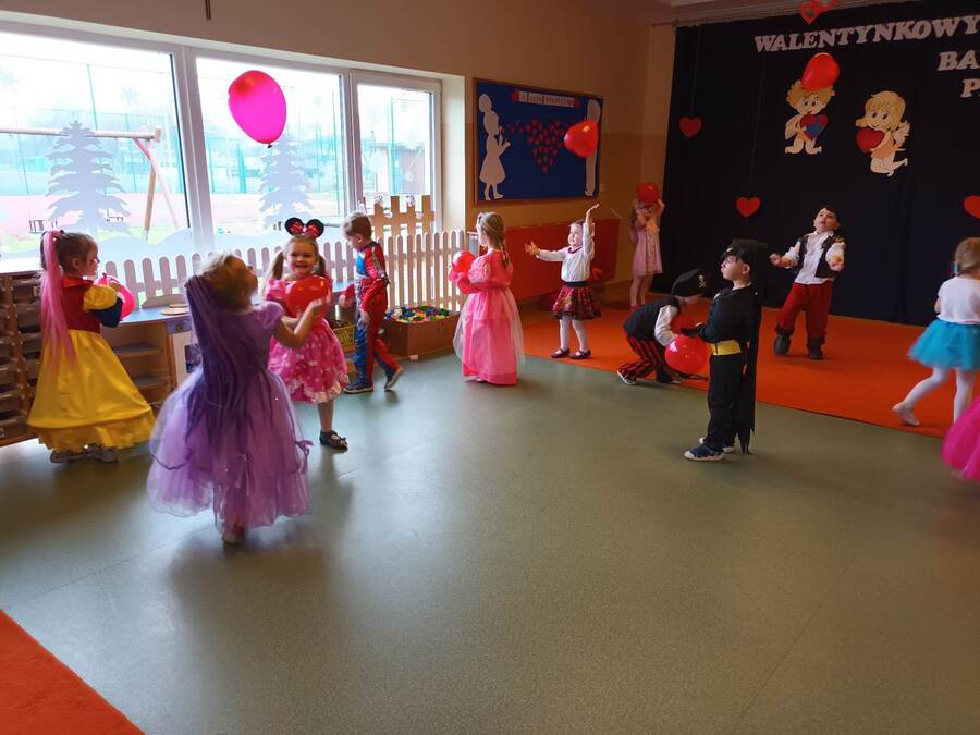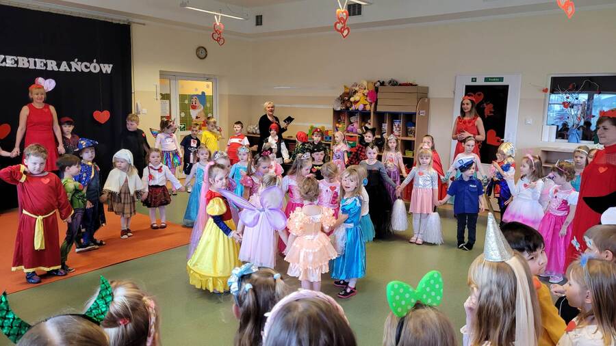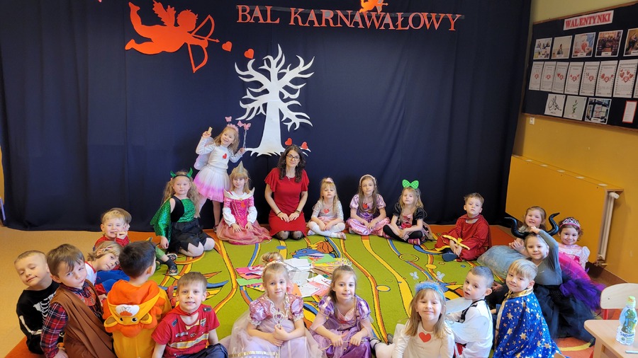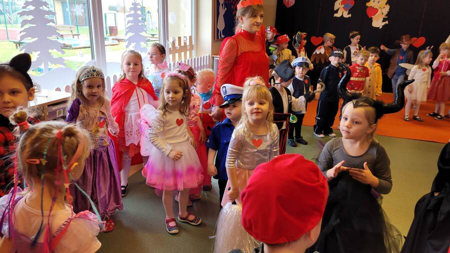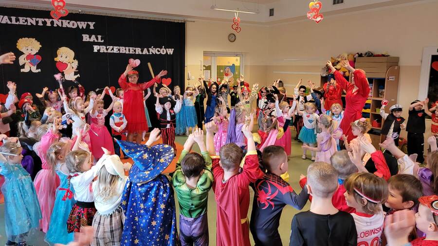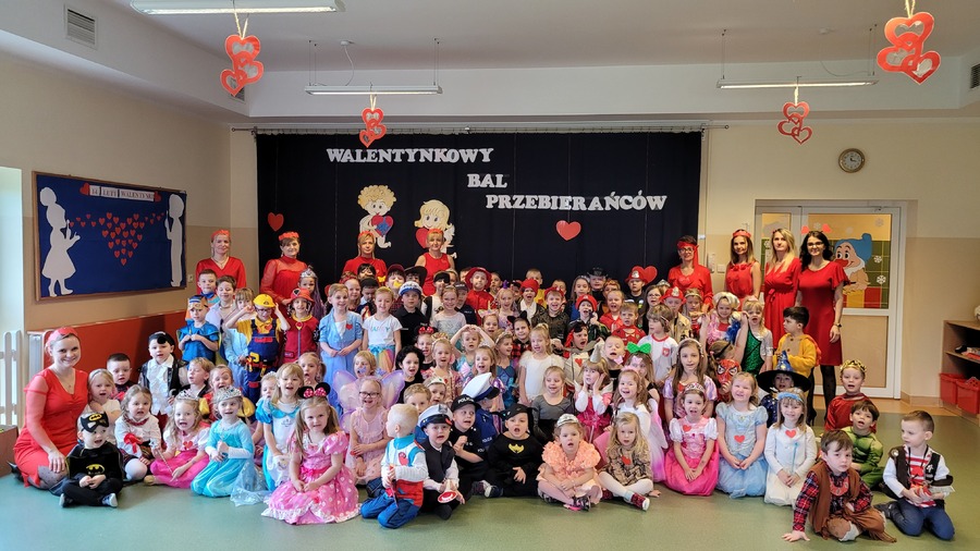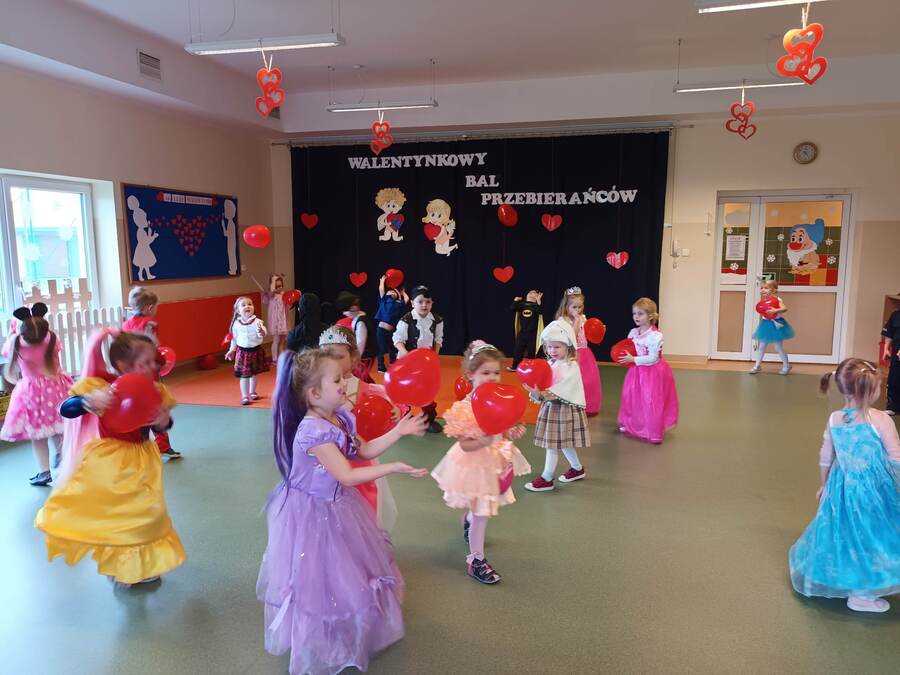14 lutego 2023r w przedszkolu połączono obchody dnia zakochanych z balem karnawałowym. Najpierw dzieci świętowały w swoich grupach gdzie prezentowały przebrania. Wspaniałe stroje, w których widoczny był również akcent „walentynkowy”, przygotowali rodzice. Przedszkolaki wspaniale się bawiły, a punktem kulminacyjnym zabawy był wystrzał walentynkowej petardy i otwarcie poczty walentynkowej, z której „Walentynkę” otrzymał każdy uczestnik zabawy.