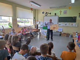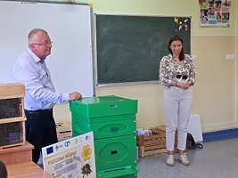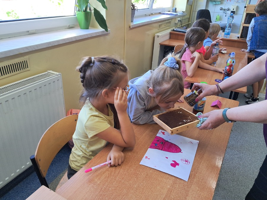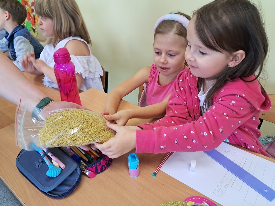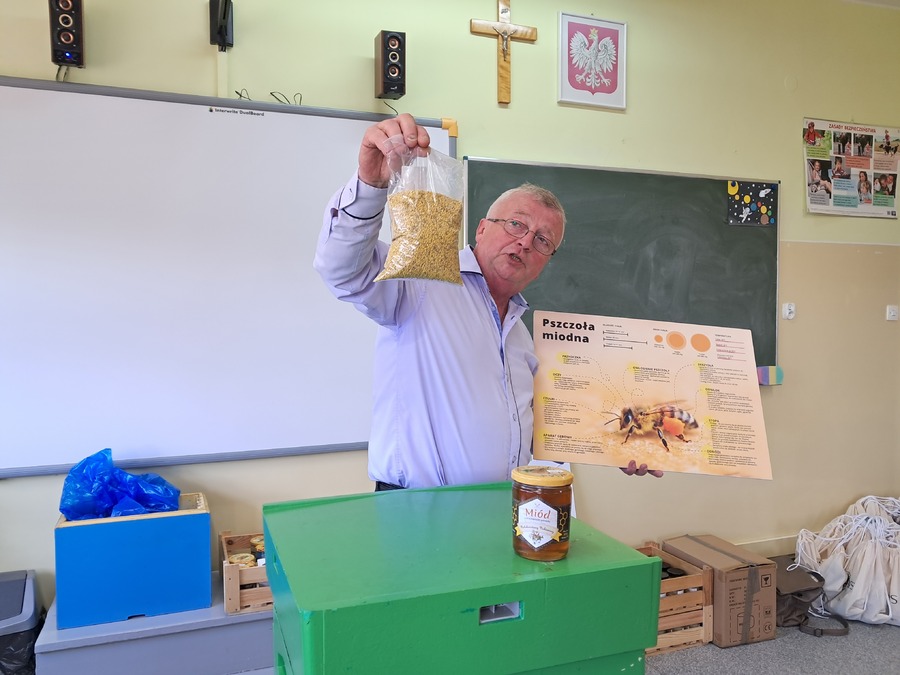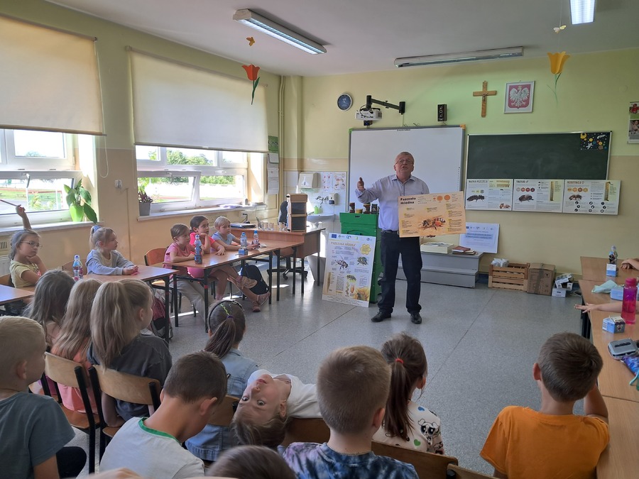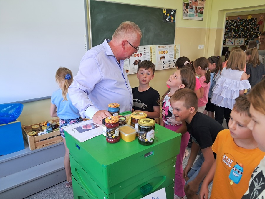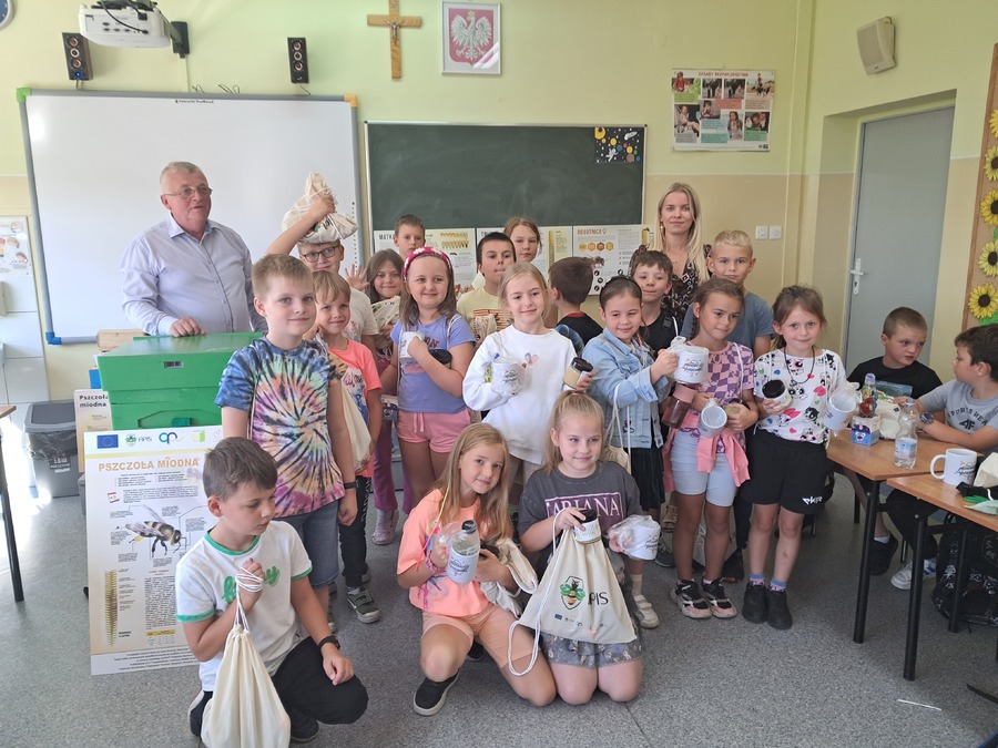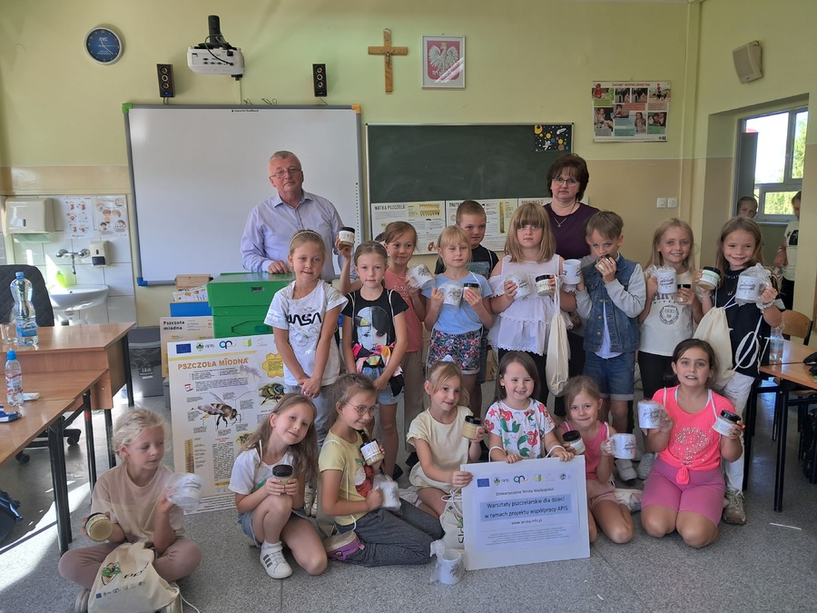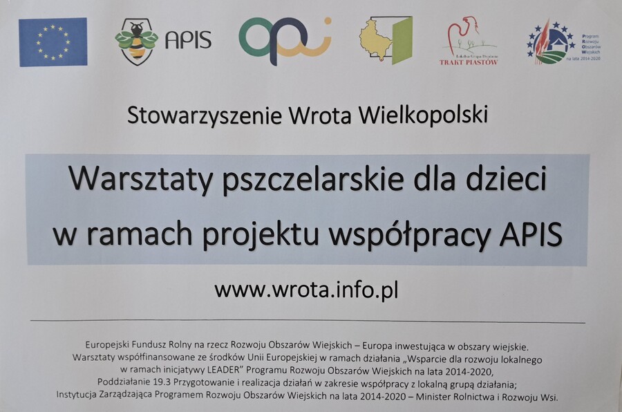 W dniu 21 września uczniowie klas drugich wzięli udział w warsztatach pszczelarskich w ramach realizacji projektu współpracy pt. „Alarm Pszczół w Interesie Społecznym” (APIS). Organizatorem spotkania było Stowarzyszenie Wrota Wielkopolski. Z uczniami swoją wiedzą podzielił się niezwykły gość, pszczelarz – Pan Jaromir Talar. Dzięki jego opowieściom dzieci zdobyły wiele cennych informacji i poznały całe mnóstwo ciekawostek z życia pszczół, a w trakcie specjalnej prezentacji fascynujący świat tych owadów. Dowiedziały się między innymi: ile kwiatów muszą odwiedzić pszczoły, aby zebrać kropelkę miodu, czym się żywią, w jaki sposób się rozmnażają i jak spędzają zimę. Uczniowie zobaczyli z bliska ul i dużą ilość pracowitych pszczół. Z dużym zainteresowaniem odkrywały kolejne tajniki produkcji miodu