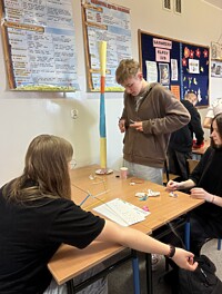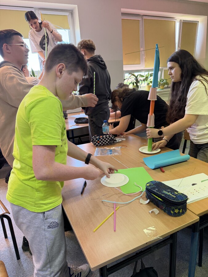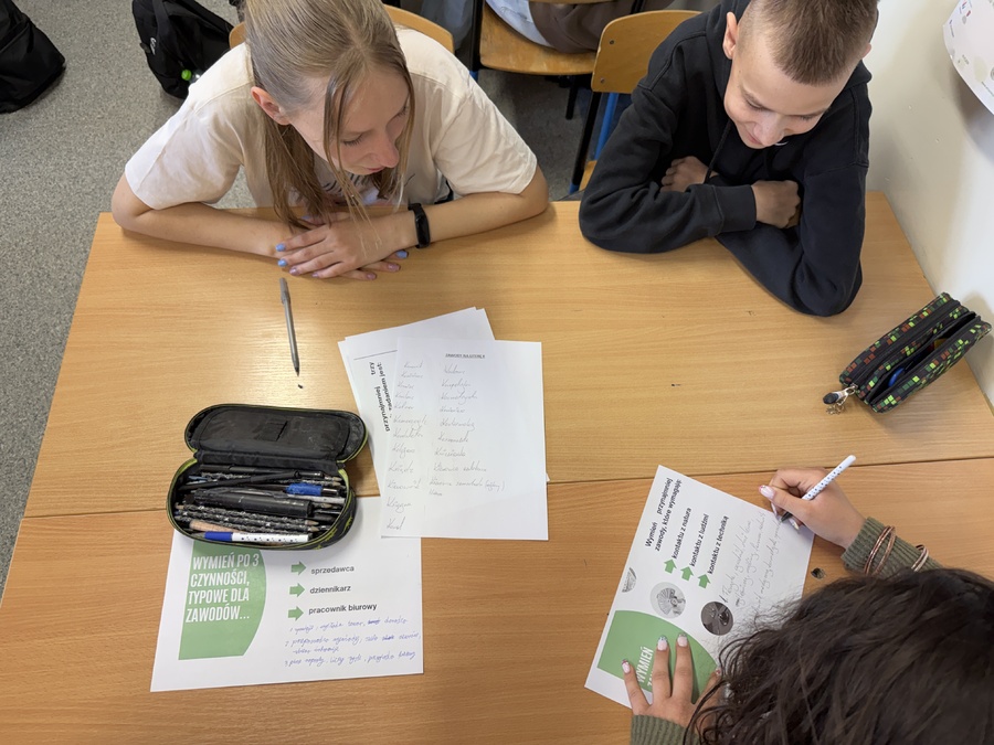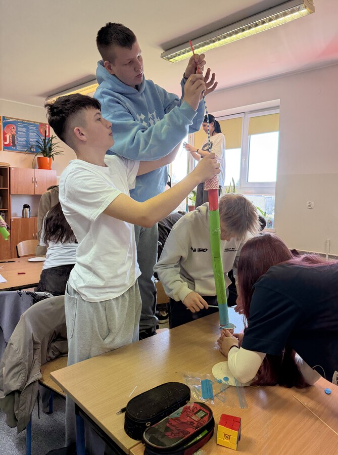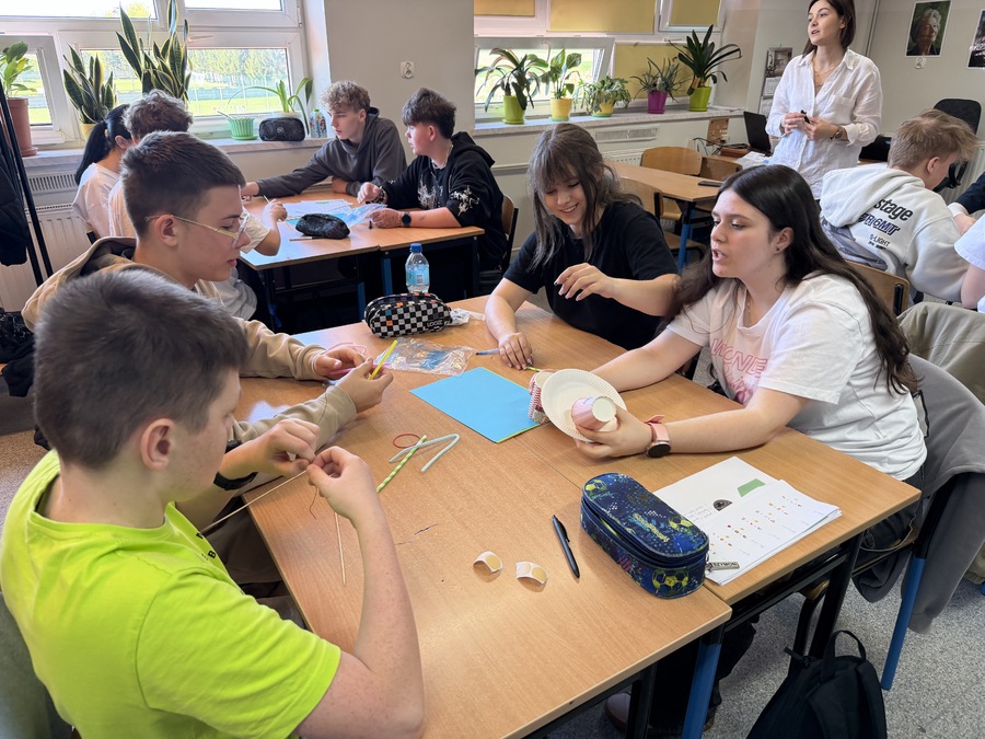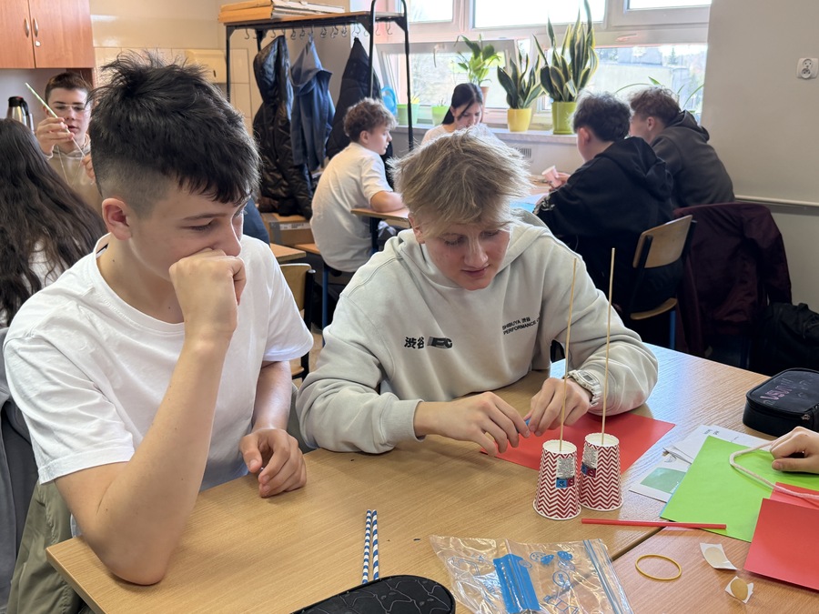 Podczas warsztatów zawodoznawczych młodzież aktywnie uczestniczyła w różnorodnych ćwiczeniach, które pozwoliły im lepiej poznać swoje predyspozycje oraz zainteresowania. Uczniowie pracowali w grupach, a jednym z kreatywnych zadań było stworzenie „ najwyższej wieży” – ćwiczenia pokazującego, jak ważne w pracy zawodowej są komunikacja, współdziałanie i zaangażowanie.