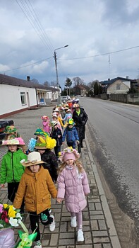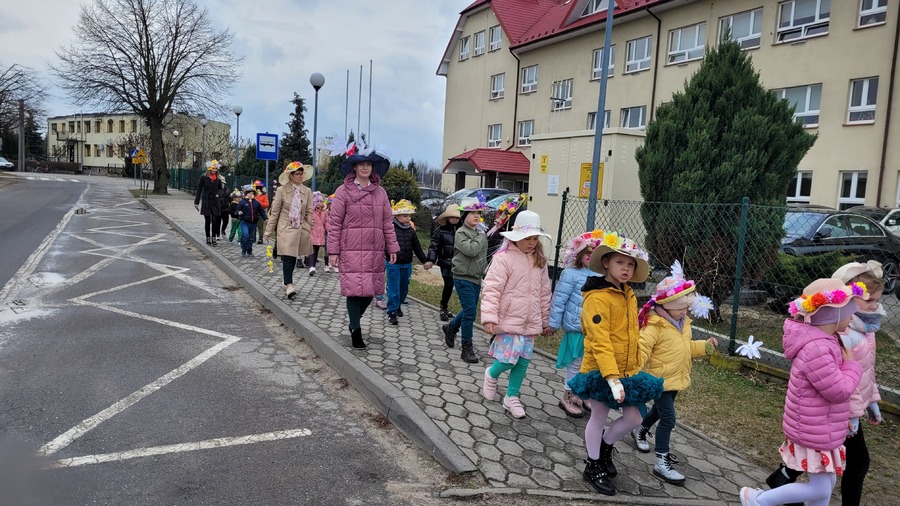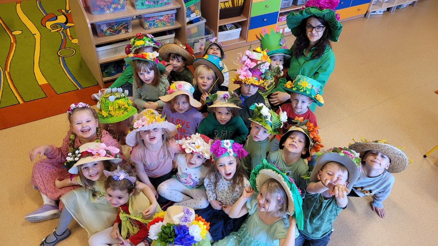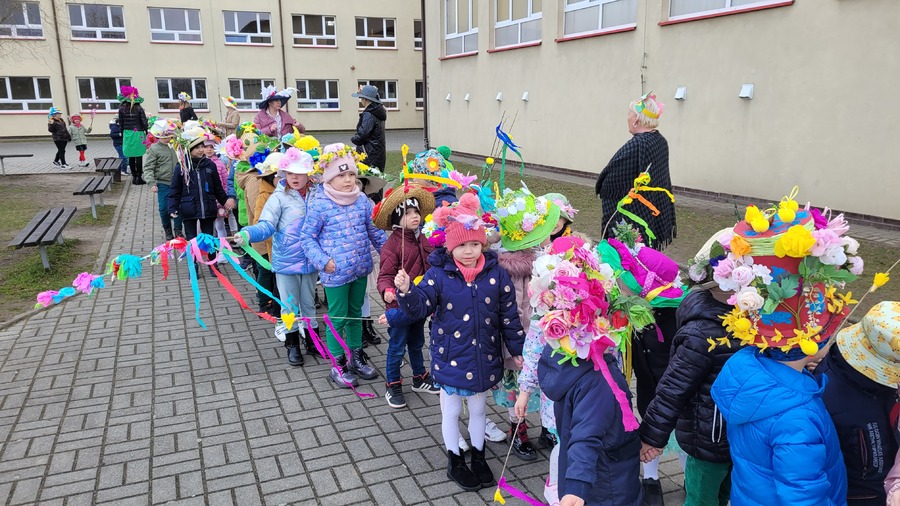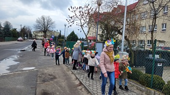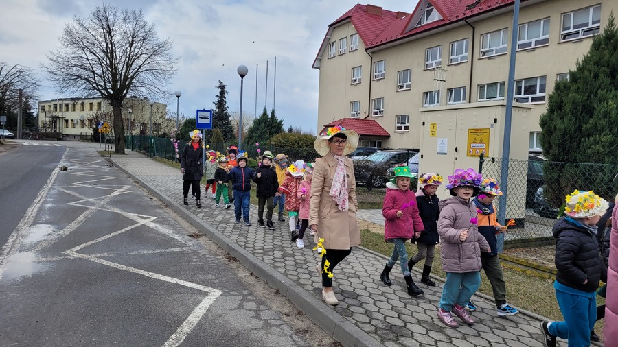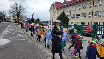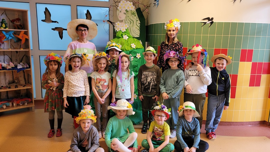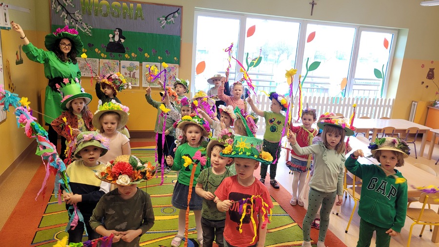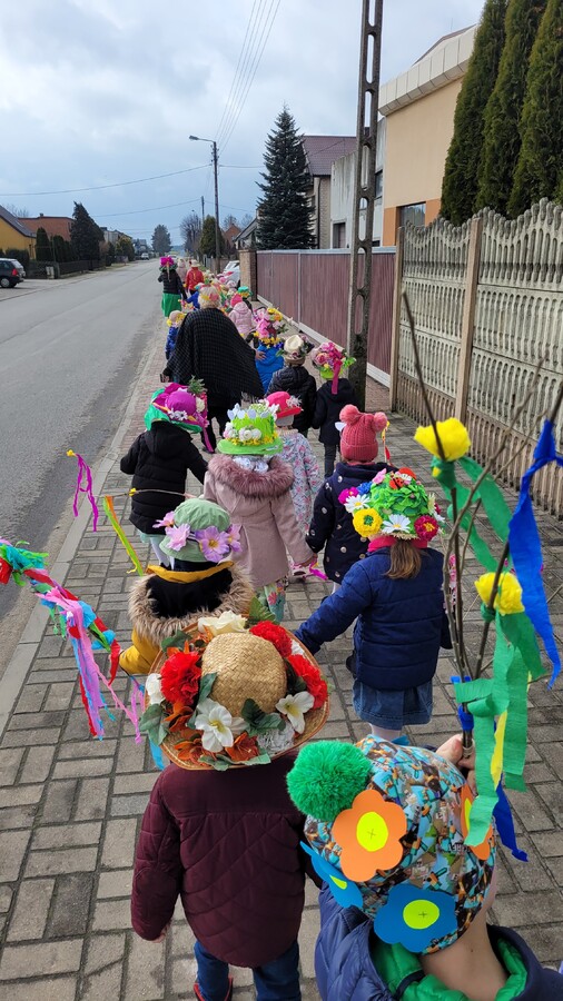 Dzieci z wszystkich grup przedszkolnych w kolorowych kapeluszach powitały wiosnę. 21 marca 2023roku roześmiana gromada spacerowała ulicami Trzcinicy szukając zwiastunów nowej pory roku. Dzieci śpiewały wiosenne piosenki, grały na instrumentach i machały przechodniom kolorowymi gaikami.