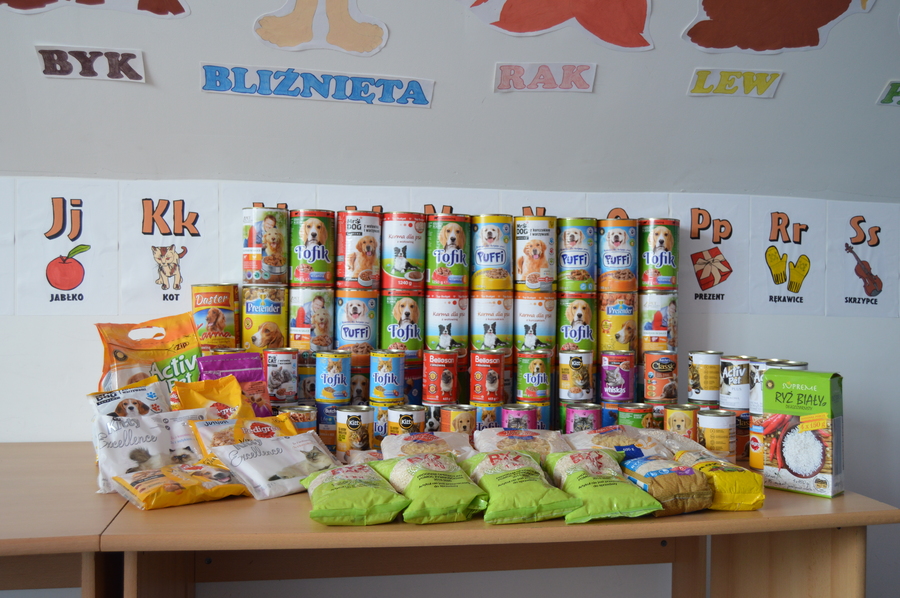 Z inicjatywy Szkolnego Koła Wolontariatu uczniowie naszej szkoły wzięli udział w zbiórce karmy dla psów ze schroniska „Azyl Psów Zapomnianych” w Wołczynie. Akcja ta cieszyła się dużym zainteresowaniem wśród uczniów. Ogółem zebraliśmy 6 dużych kartonów karmy (karma w puszkach, makaron, ryż). Najwięcej karmy zebrali uczniowie klasy IVb, a rekordzistką była uczennica tej klasy – Marta Kozińska, która przyniosła kilkanaście puszek karmy.