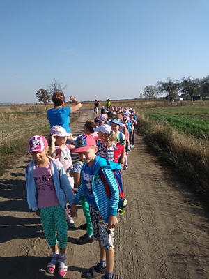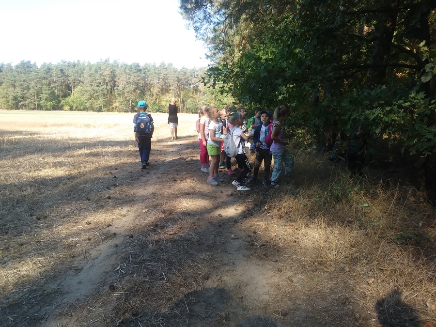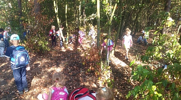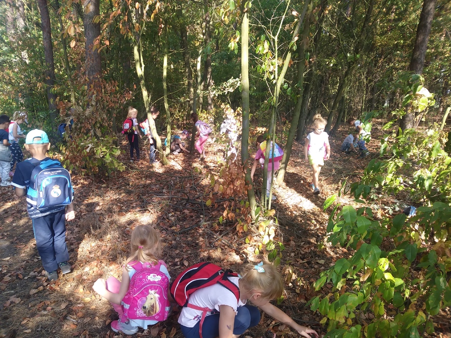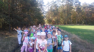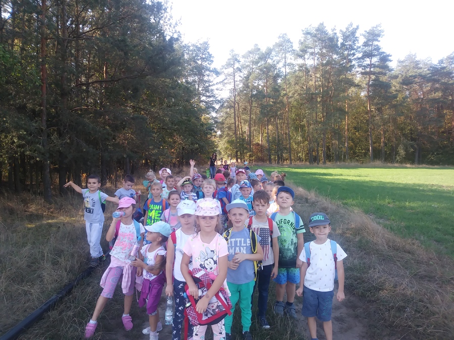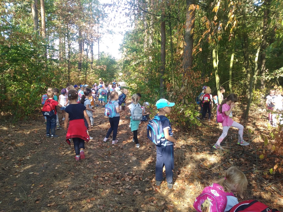 Wraz ze zbliżającą się jesienią dzieci z przedszkola dnia 21 września 2018r. wyruszyły na pieszą wycieczkę do lasu. Korzystając ze słonecznej pogody przedszkolaki z grup: „Smoki Dinusie” i „Muchomorki” dzielnie pokonały trasę dzielącą przedszkole z pobliskim lasem. Tam miały okazję bezpośrednio poobserwować naturalne środowisko, zebrać dary lasu i przynieść ze sobą do kącików przyrody. Rodzice z nauczycielkami zadbali o to, by na leśnej polanie dzieci mogły się posilić i napić. Wyprawa okazała się wspaniałą przygodą i udowodniła, że dzieci uwielbiają spacery i zabawę na łonie natury.