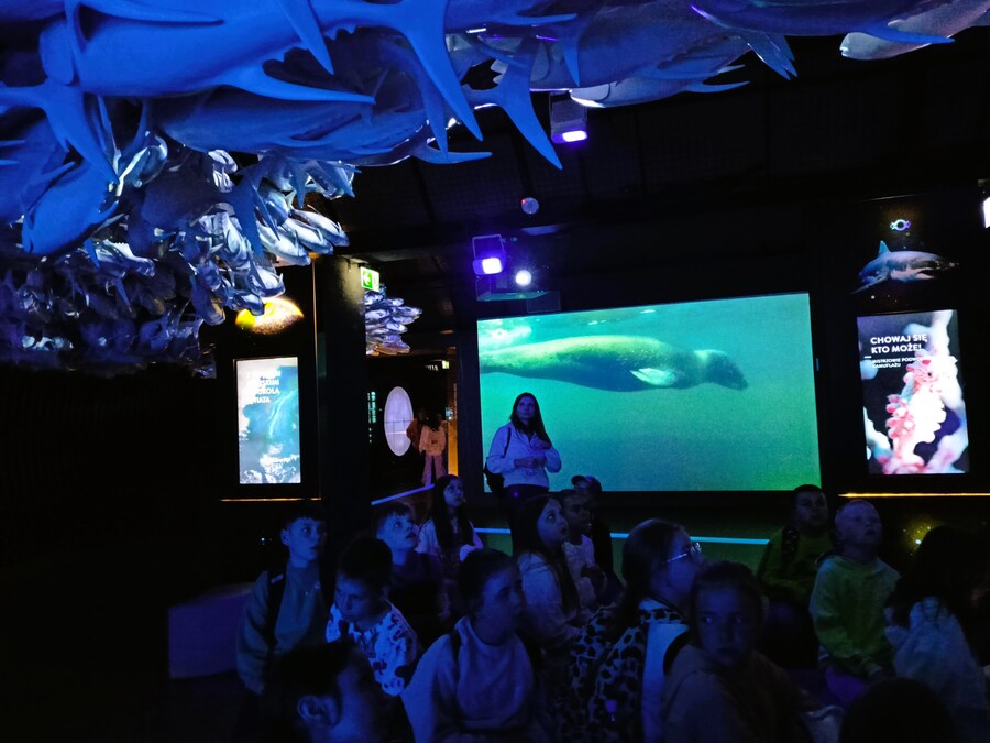 Tutaj Uczniowie z zainteresowaniem słuchali przewodnika, który ciekawie prezentował niesamowity świat morskich głębin oraz wyjaśniał jakie znaczenie ma woda w życiu ludzi.