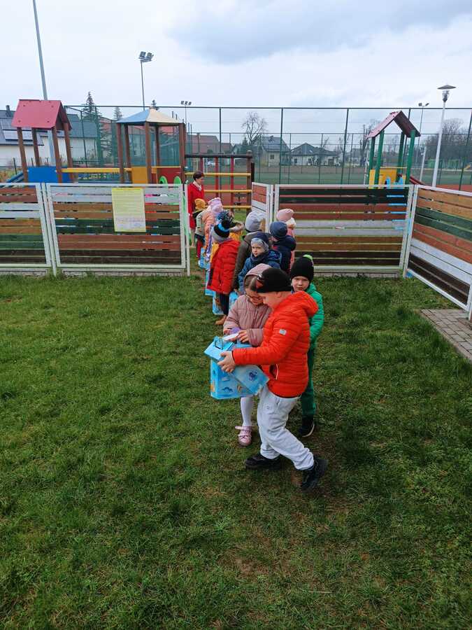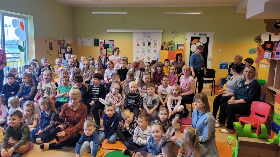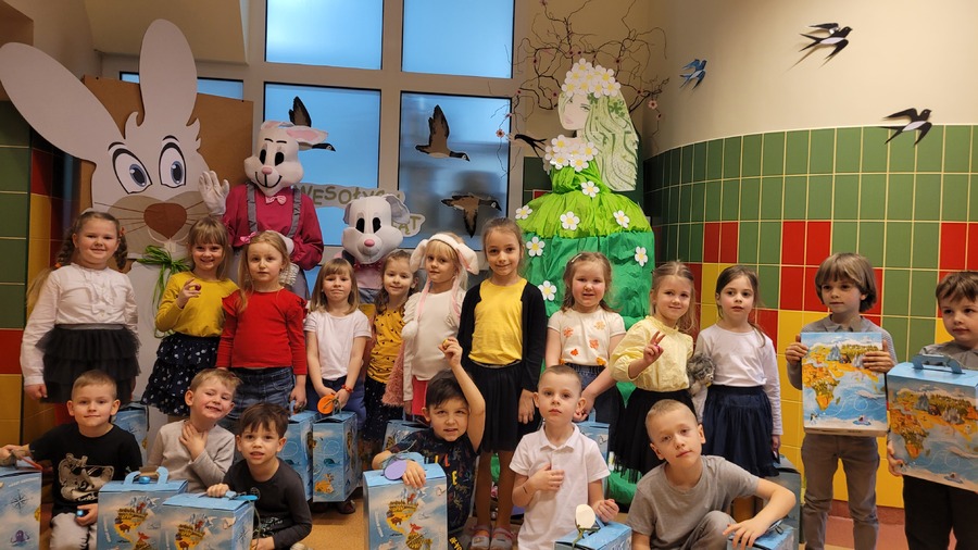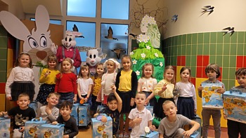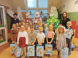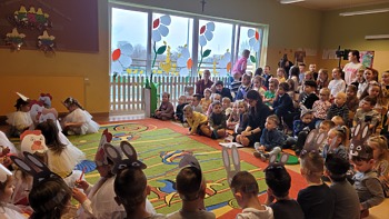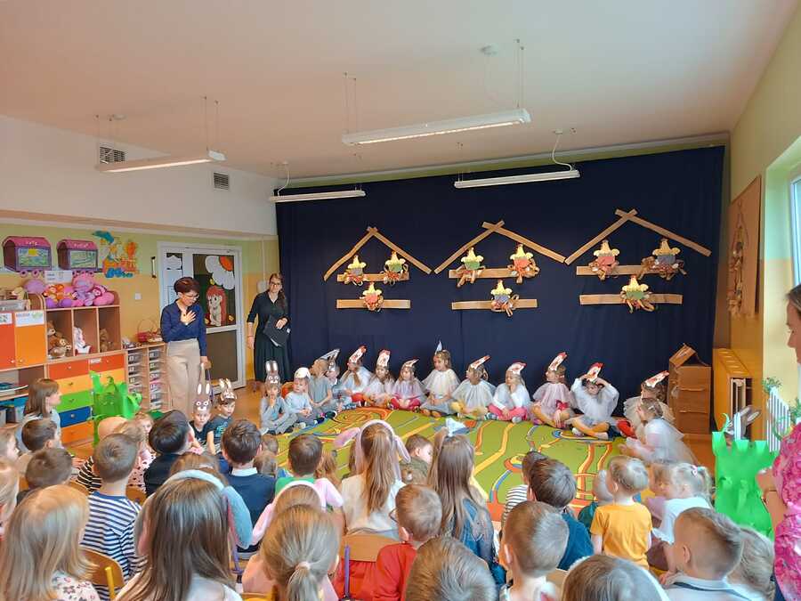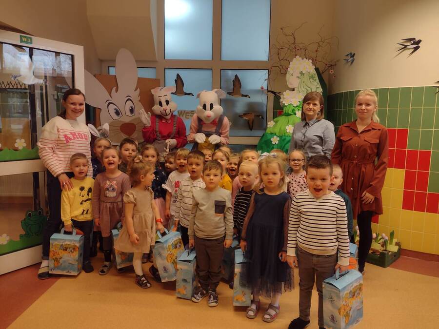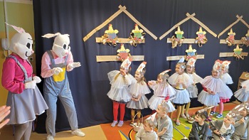 05 kwietnia 2023r dzieci z grupy „Jeżyki” pod czujnym okiem pani Aurelii Woźnicy przygotowały pełen humoru teatrzyk pt. „Zajączek w przedszkolu”. Do jego obejrzenia zaprosiły wszystkich przedszkolaków, panie kucharki i panie dyrektor Małgorzatę Hadzik i Ewę Hetmańczyk. Po przedstawieniu pojawiła się w przedszkolu rodzina Zajączków, która oznajmiła, że ma dla dzieci prezenty, ale dzieci muszą ich poszukać. Przedszkolaki szybko się ubrały i poszły na plac zabaw szukać prezentów. Rodzina Zajączków czekała cierpliwie, aż wszyscy wrócą z prezentem i będzie można zrobić sobie wspólne zdjęcie.
