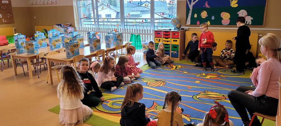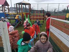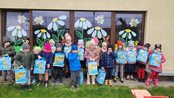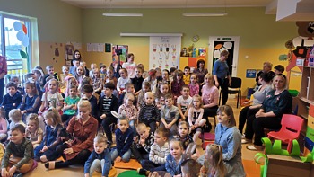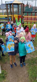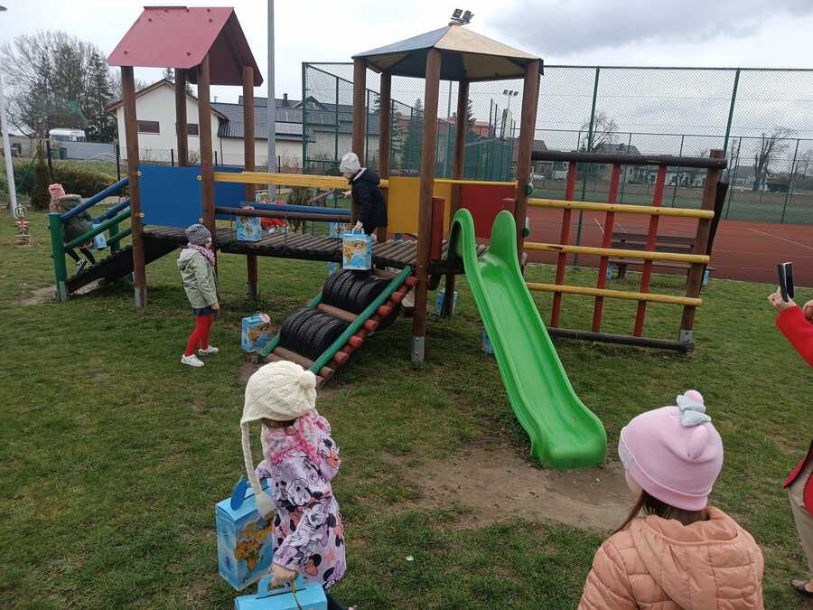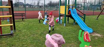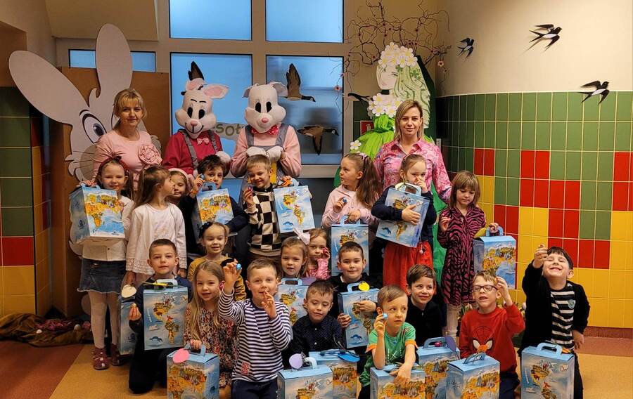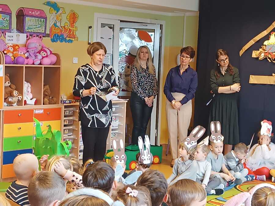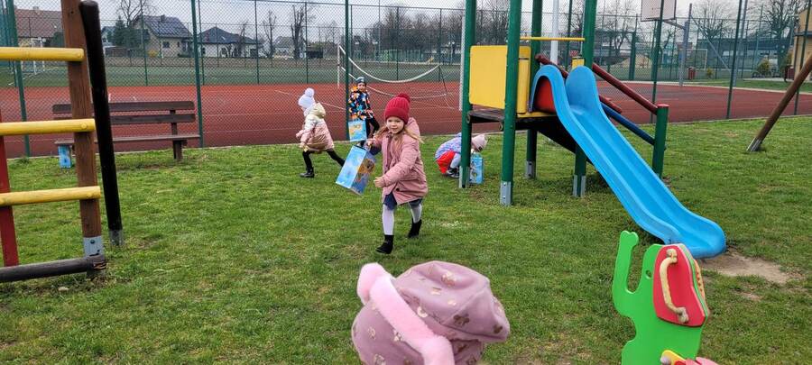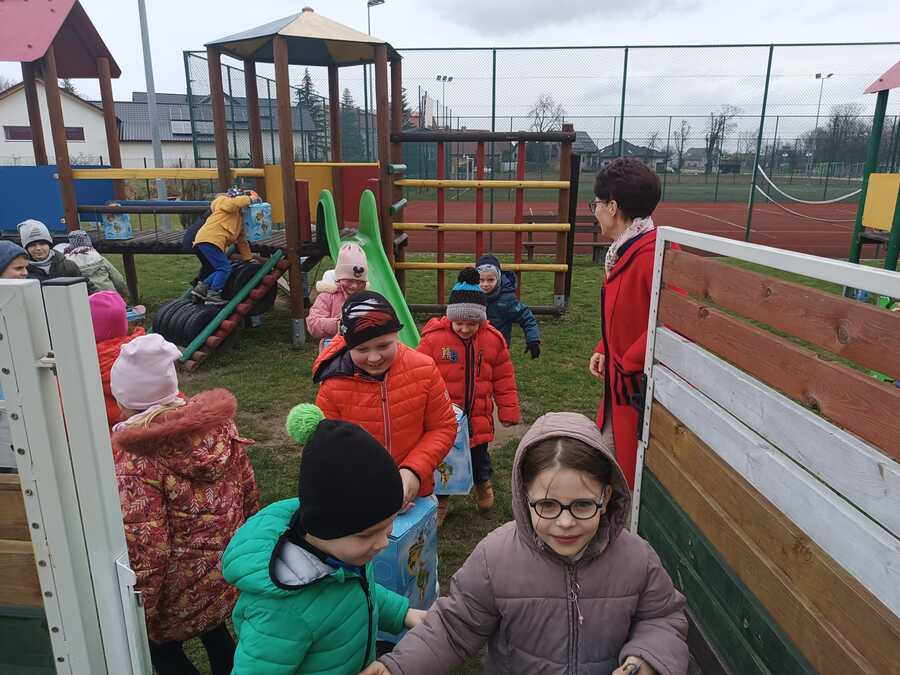 05 kwietnia 2023r dzieci z grupy „Jeżyki” pod czujnym okiem pani Aurelii Woźnicy przygotowały pełen humoru teatrzyk pt. „Zajączek w przedszkolu”. Do jego obejrzenia zaprosiły wszystkich przedszkolaków, panie kucharki i panie dyrektor Małgorzatę Hadzik i Ewę Hetmańczyk. Po przedstawieniu pojawiła się w przedszkolu rodzina Zajączków, która oznajmiła, że ma dla dzieci prezenty, ale dzieci muszą ich poszukać. Przedszkolaki szybko się ubrały i poszły na plac zabaw szukać prezentów. Rodzina Zajączków czekała cierpliwie, aż wszyscy wrócą z prezentem i będzie można zrobić sobie wspólne zdjęcie.