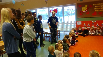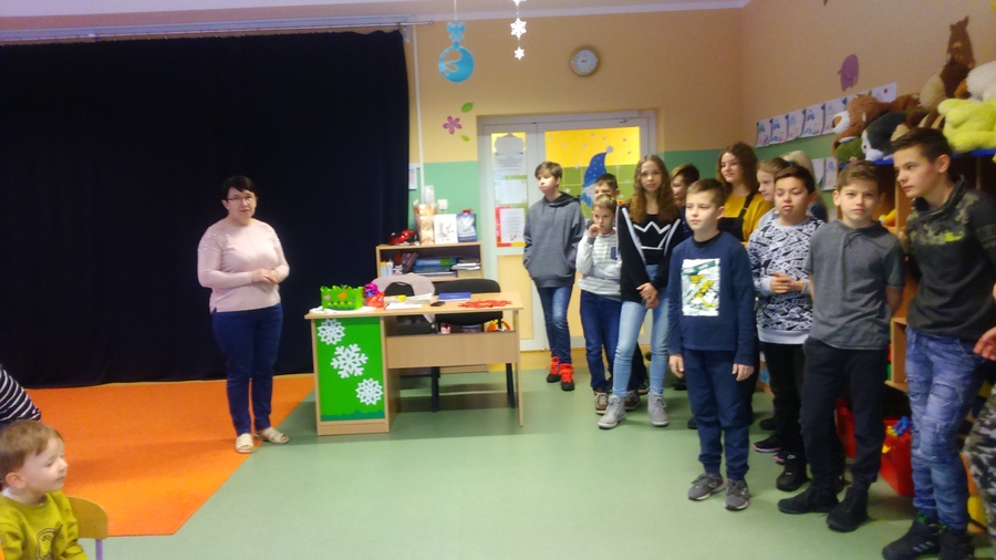 Drugim punktem wizyty szóstoklasistów w przedszkolu było spotkanie z nauczycielkami przedszkola. Uczniowie zobaczyli na czym polega praca przedszkolanki i w jakich warunkach panie pracują. Zostali bardzo ciepło przyjęci. Dla większości uczniów była to pierwsza wizyta w sąsiadującym ze szkołą przedszkolu.