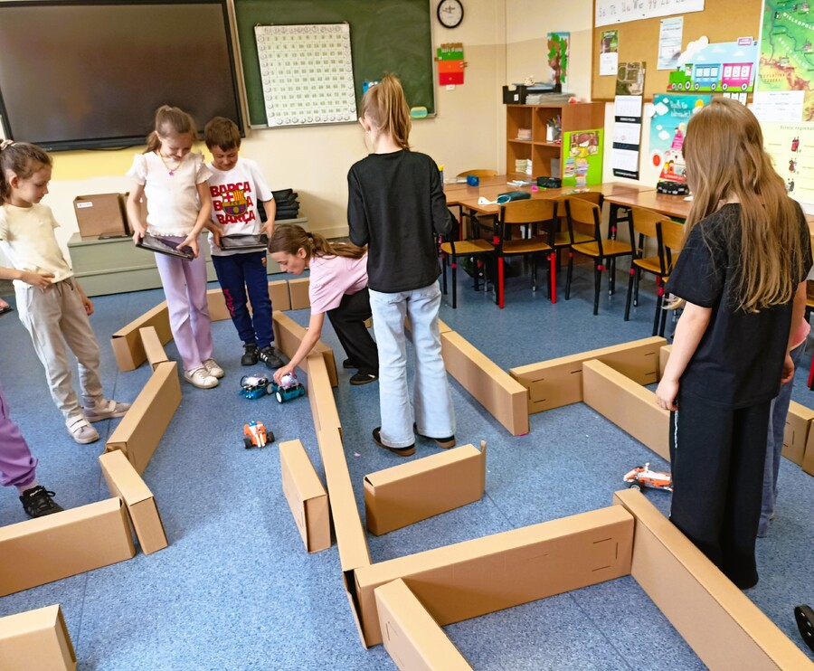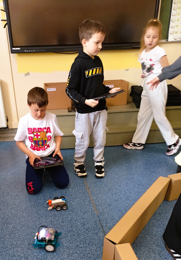 Tym razem zajęcia z robotyki zagościły w klasie IIa, podczas których uczniowie pod okiem pani Magdaleny Wypych odkrywali obsługi i sterowania różnymi pojazdami. Każdy miał możliwość spróbowania swoich sił w prowadzeniu robota po przygotowanym wcześniej torze.
